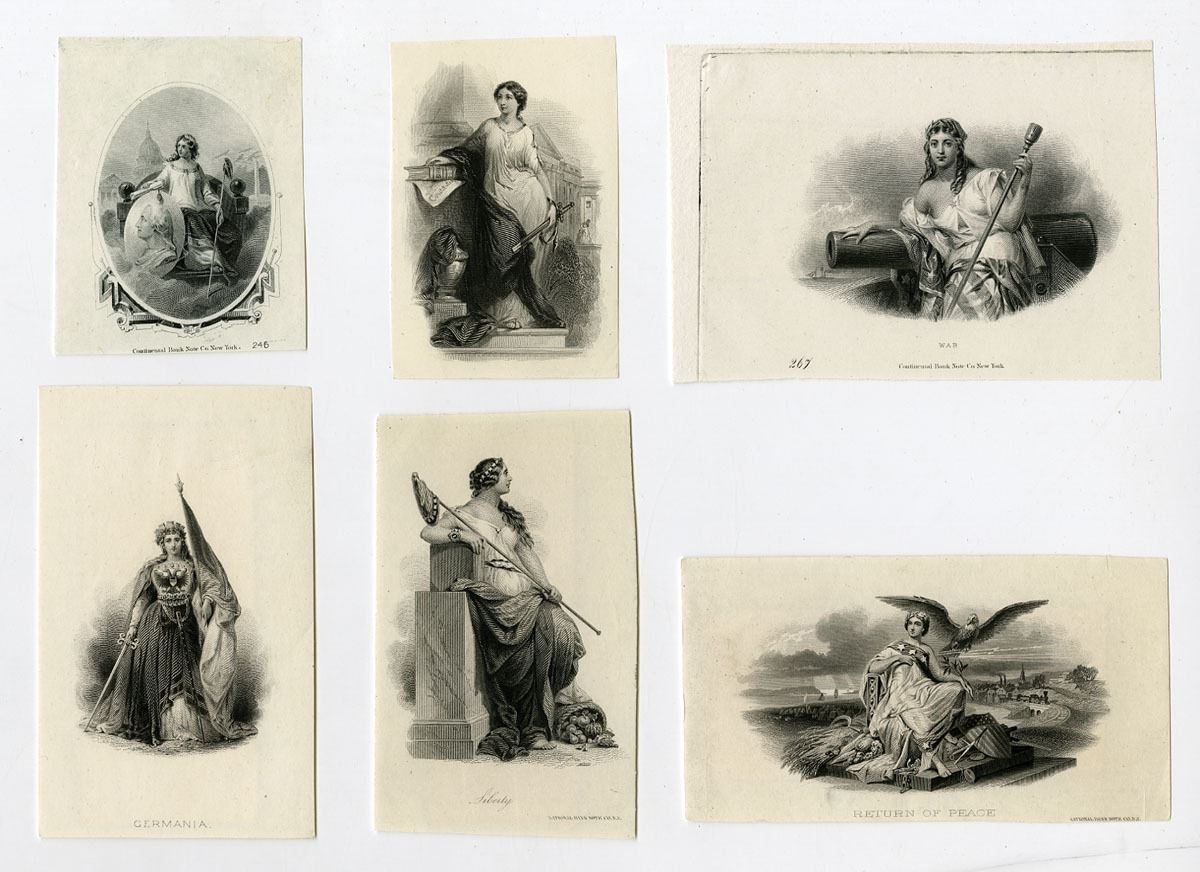 New York, ND (1850-70s). Lot of 6 Proof Vignettes used on obsolete banknotes, checks, drafts, stocks, bonds and fiscal documents, each of an allegorical woman sometimes alone and sometimes with an Eagle, Some of the vignettes include titles "Return of Peace," "Liberty," "War," and "Germania" and others just have plates numbers. Vignettes are in AU to Uncirculated condition. Printer are National BNC and Continental BNC. (6). Sold "AS IS" no returns accepted.