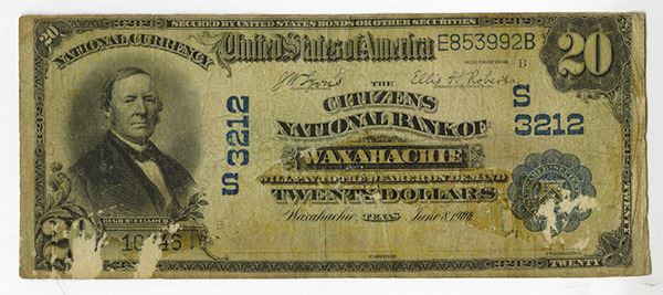 Waxahachie, TX. $20, Issued banknote, S/N E853992B, Choice VG to Fine condition with some 2 areas of thins on lower left and lower right obverse, resulting in partially missing features of the seal and bottom left design. This is the first $20 Date Back found and unlisted in Track & Price census.