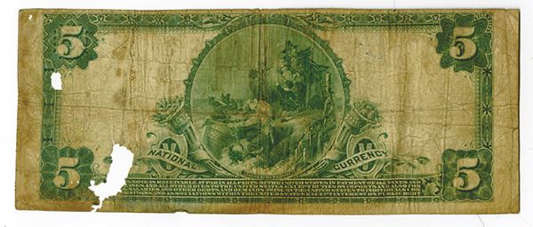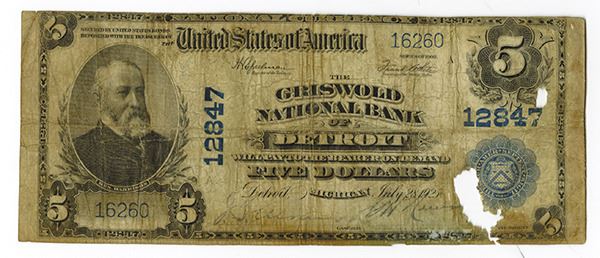 Detroit, MI. $5, Issued banknote, S/N 16260, Very Good condition with two missing pieces, one near the seal and one near the denomination at top right.