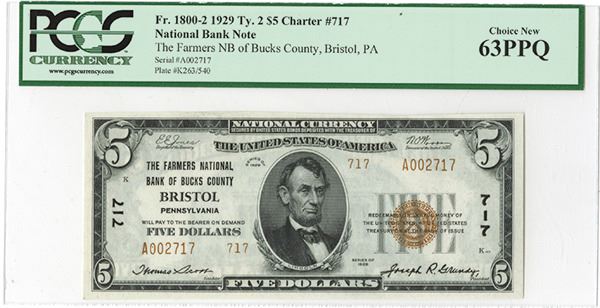 Bristol, PA. $5, Type 2, Issued banknote, S/N A002717, PCGS Currency graded Choice New 63 PPQ.