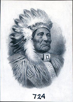 ca.1880's-1930's. 8 different LDP or cut down LDP vignettes of Native American Indian Chiefs in full feathered headdress. The vignettes range from 2 to 3 inches. All are printed on india paper only. One is titled "Chief Santo". Vignettes were used on Wells Fargo Traveler's Checks and miscellaneous security printed documents. Printers are un-attributed but include Republic BNC and others. Condition ranges from VF to choice uncirculated condition. Please inspect. Rare Native American vignettes. RBNC.