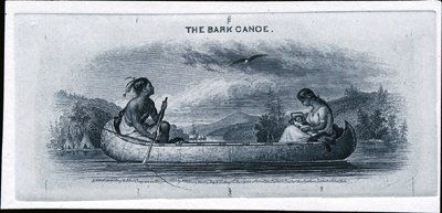 Used on Obsolete Banknotes, stocks & bonds. ca.1840's-1950's. 2 different LDP vignettes of Native Americans in canoes. The vignettes are 4.5 by 2 inches in size. Both are printed on india paper only. One is titled "The Bark Canoe". Printers include WHHW and un-attributed. Condition ranges from XF (one has a very small tear in the top margin away from the design) to choice uncirculated condition. Please inspect. Rare Native American vignettes.