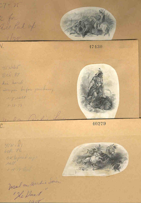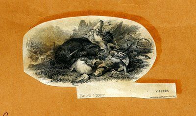 ca.1850's-70's. 4 different vignettes of Native Americans fighting bears (2); with bear that he killed and with elk after the hunt. All are printed on india paper and mounted on manila file folders or manila cards with archival notations on each folder listing the condition of the dies and rollers and that the vignettes were used on the 1988 Archive Series "The Hunt"; . 1). "Bear Fight" with wounded bear attacking downed horse and rider. Printed by NBNC; 2). Dramatic vignette of Bear attacking 2 Native Americans. Printed by TCC; 3). "Aboriginal" vignette of Native American with foot on bear he killed. Printed by ABNC; 4). Native Americans with elk they have killed. Printed by CBNC. Choice group. ABNC, TCC, CBNC, NBNC.