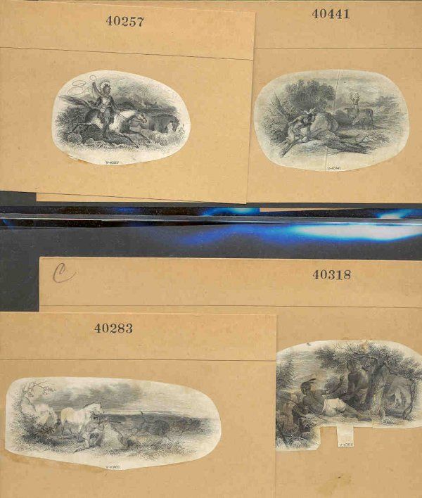 ca.1840-1860's. 9 different proof vignettes of Native Americans hunting buffalo (6) and deer . All are printed on india paper and mounted on manila cards. Printers include DWC; BCC and TCC. Mostly choice condition with some minor toning. Rare hunting vignettes.