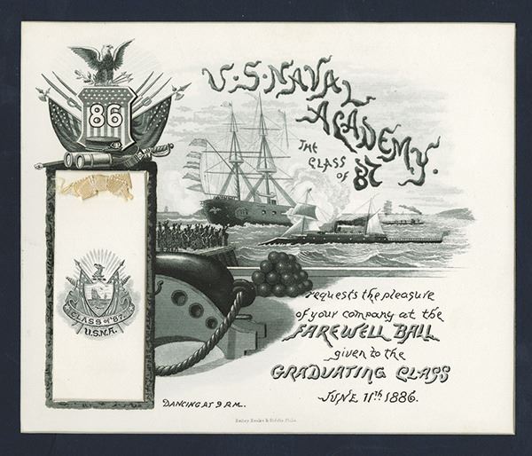 United States. Class of 1887 invitation for the Farewell Ball for the Class of 1886 at Annapolis. Great graphics on heavy card stock, Under the flap with the Academy emblem is a list of committee members names. Invitation printed by Bailey, Banks & Biddle, Philadelphia. As made. Pristine.