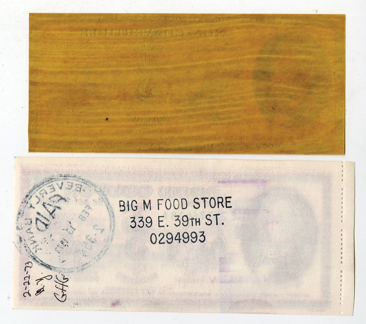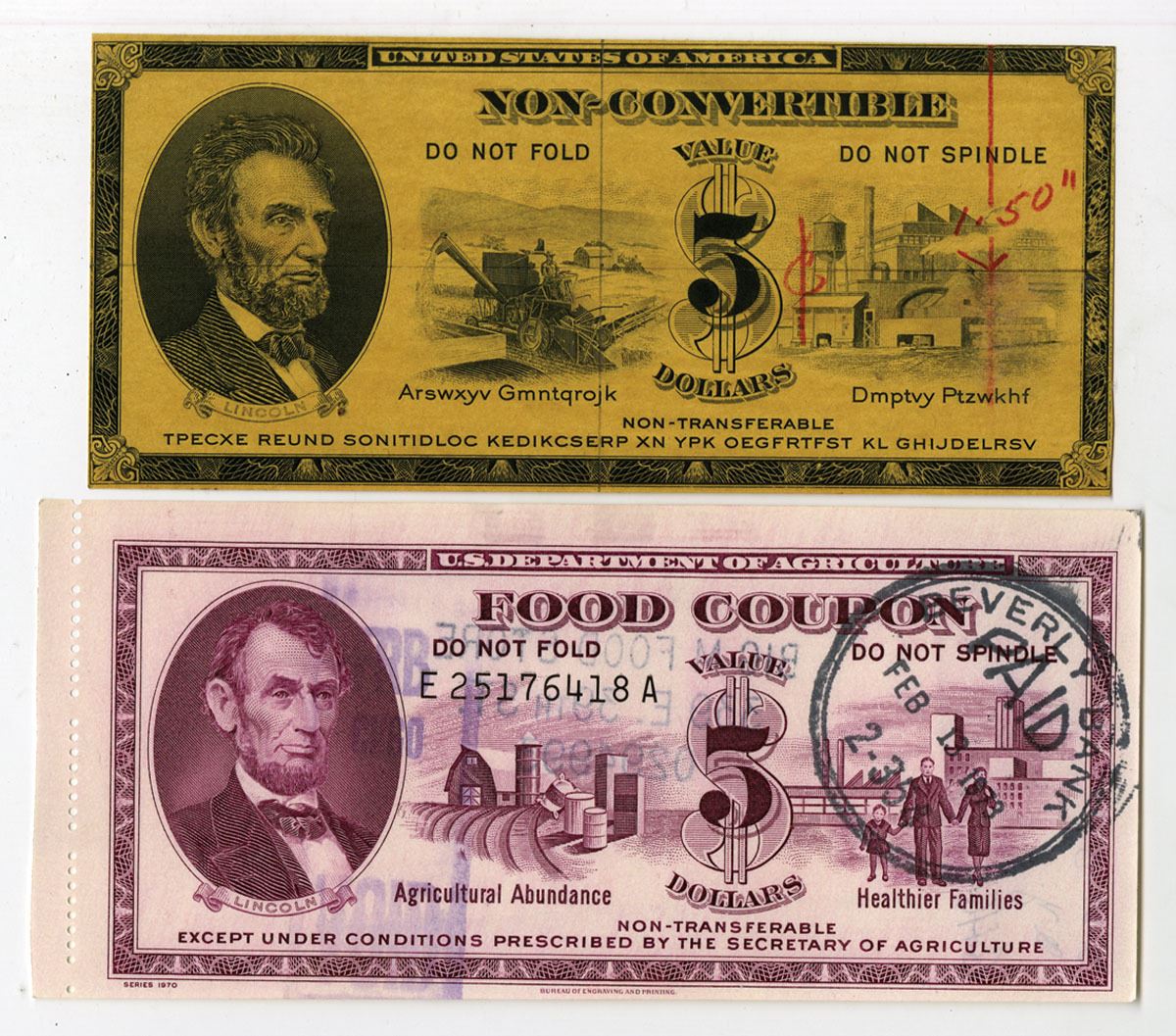 Washington, D.C., ND (ca.1950-70s), Lot of 2 Food Coupons, Includes $5, Essay Die Proof of a proposed Food Stamp design with Lincoln on the left, grain harvester in middle left, denomination in middle and factory on right, The text on the essay includes "Non-Convertible" and then nonsense letters on the bottom to fill in for the future printed wording. "Do Not Fold" and "Do Not Spindle" in text below title. Black intaglio printing on light orange-yellow colored paper, previously mounted with evidence of glue remnants on back, cut close to margins, no printer listed but it came from the American Bank Note Archives and could have been printed by the B.E.P., ABN, or Security BNC. This design was never used exactly in this form, but is similar to other Food Stamp designs. There are also archival markings on the proof in red including measurements relating to sheet layout. Also included is an I/C $5 Food Stamp with Lincoln on the left, with a similar layout of text. The issued example has the imprint of the B.E.P. at the bottom and "Series 1970". The denomination and letter fonts look exactly like the proof lettering, so the B.E.P. probably designed this essay. Rare with only 4 examples found in the ABNC archives in 2005.