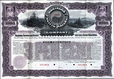 1896. $1,000. Specimen Registered General Lien Railway and Land Grant 3% Gold bond. Purple border in horizontal format. Allegorical statues of men on upper left and right with Trees and mountains in middle with title. XF condition. Red specimen overprints, POC's and "00000" serial numbers. No coupons attached. Rare certificate. ABNC.