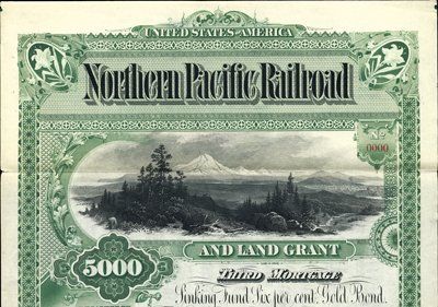 1887. $5,000. Specimen Registered, 3rd Mortgage, Sinking Fund, 6% Gold Bond. Green border in vertical format. Dramatic forest and mountain scene on top. XF condition. Red specimen overprints, POC's and "00000" serial numbers. No coupons attached. Rare certificate. ABNC.