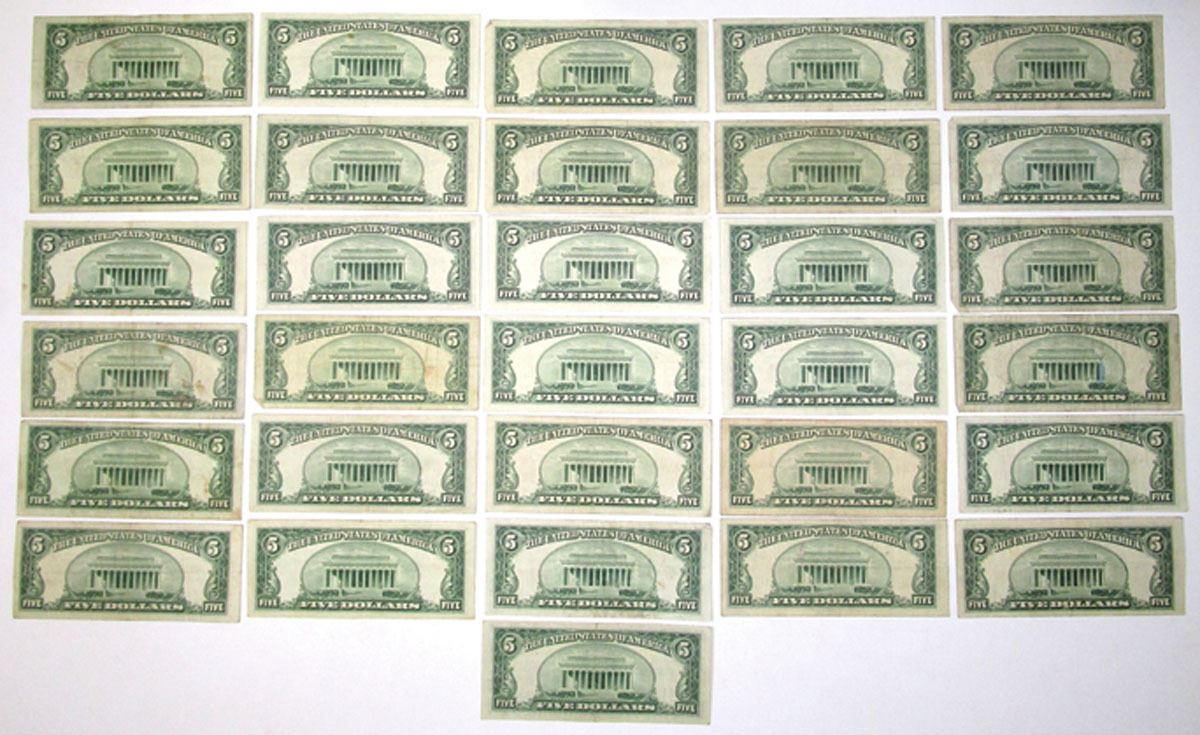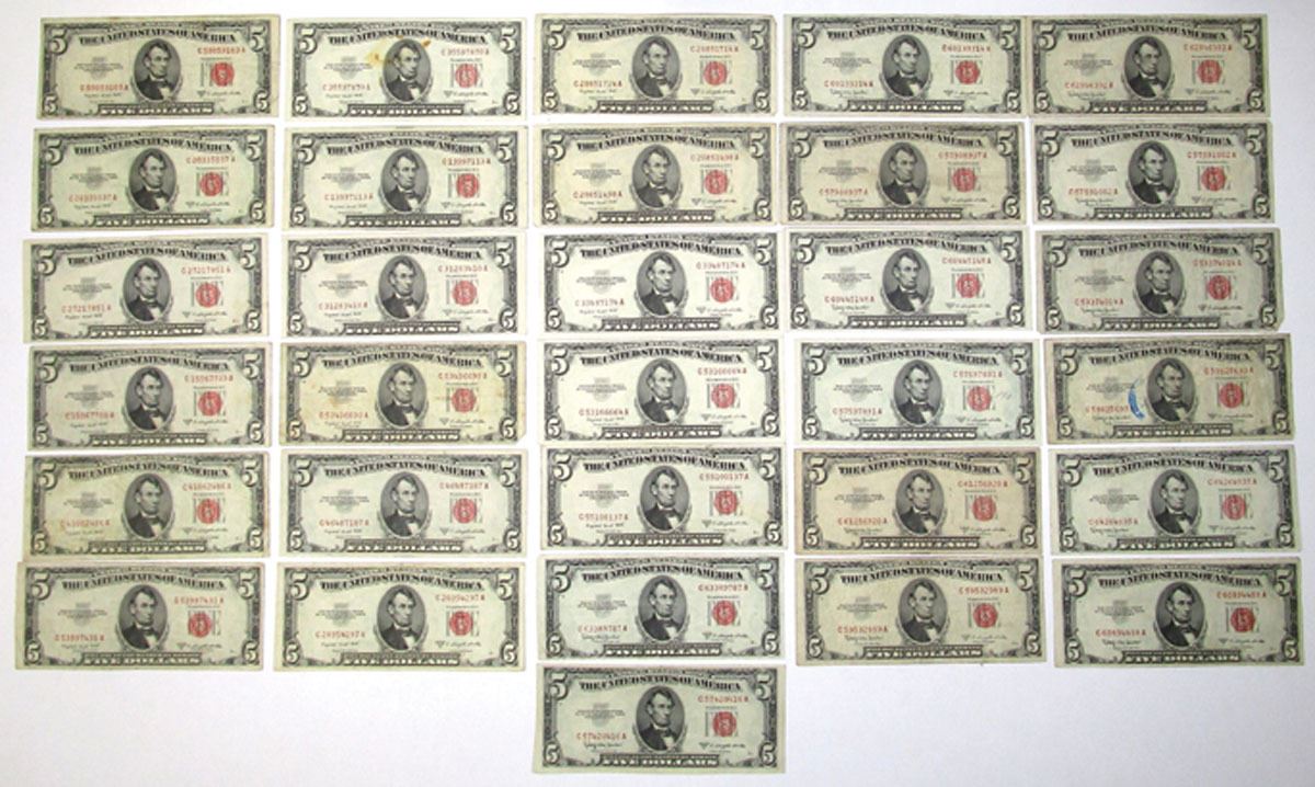 Washington, D.C., 1953. Lot of 31 Issued Banknotes, Includes: $5, P-381b (17), Series of 1953B, Fr.# 1534, Smith | Dillon signatures; $5, P-381c (14), Series of 1953C, Fr.# 1535, Granahan | Dillon Signatures. All notes have red seal at right, Condition ranges from Choice Fine to XF. (31). Sold "AS IS" no returns accepted.