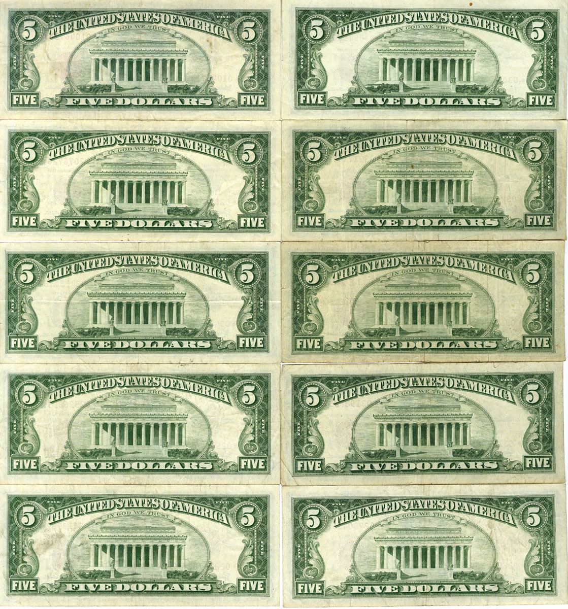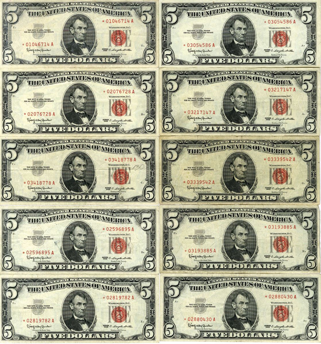 Washington, D.C., U.S. Note - Legal Tender, Lot of 10, $5 Series of 1963, FR. 1536* Replacement or Star Notes, Issued Group of 10 Banknotes, Red Seal, Granahan | Dillon signatures, Condition ranges from Fine to Choice VF. (10)