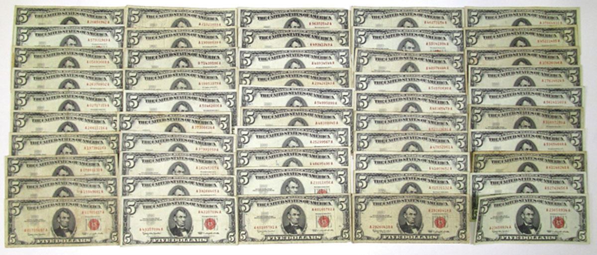Washington, D.C., U.S. Note - Legal Tender, Lot of 50, $5 Series of 1963, FR. 1536 Issued Banknotes, Red Seal, Granahan | Dillon signatures, Condition ranges from Fine to Choice XF-AU. (50)