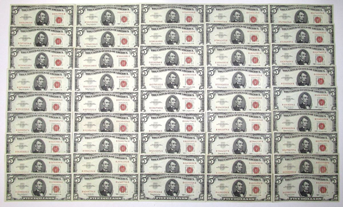 Washington, D.C….., Lot of 45, 1963. $5 P-383, Series of 1963, Fr.# 1536, Issued Collection of Banknotes, Granahan | Dillon signatures, Red seal at right, Condition ranges from Fine to Choice XF. (45). Sold "AS IS" no returns accepted.