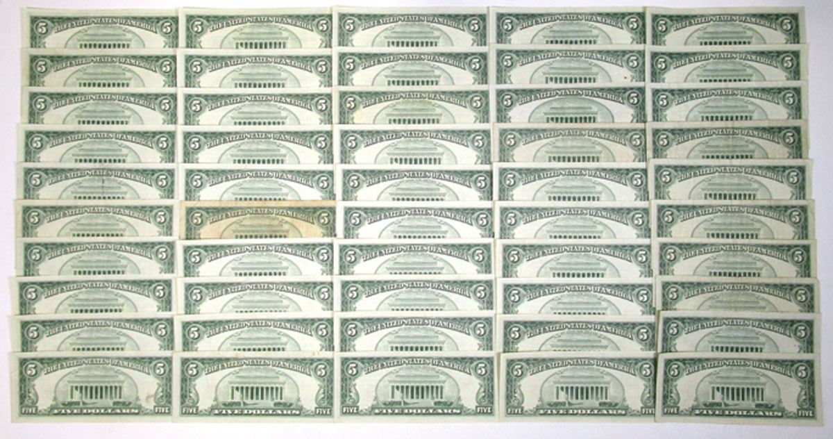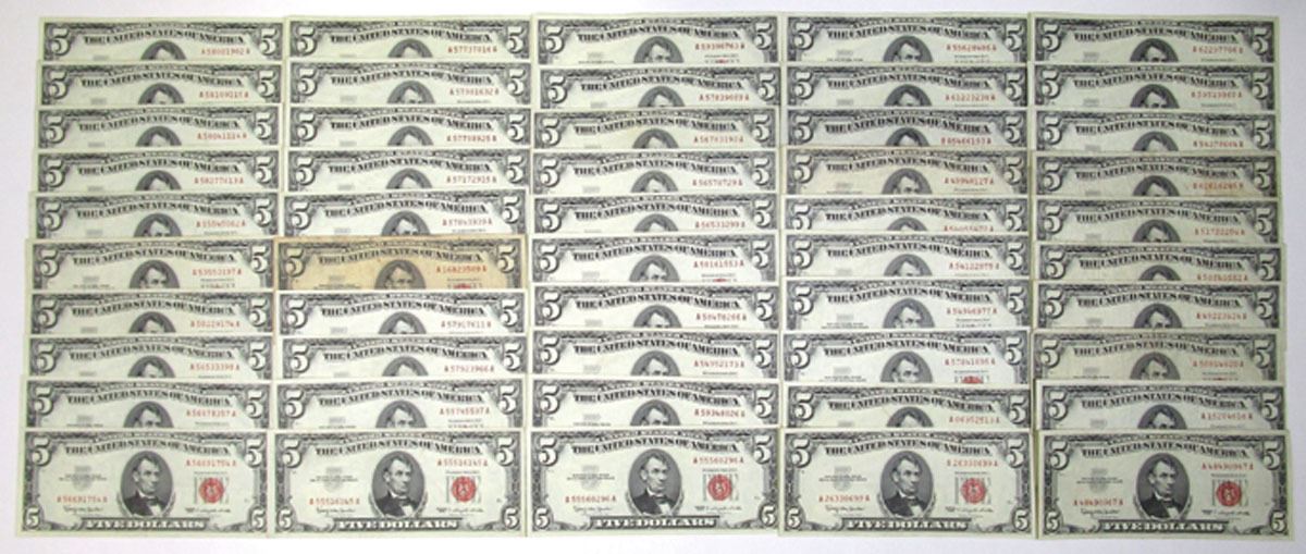 Washington, D.C., Lot of 50, 1963. $5 P-383, Series of 1963, Fr.# 1536, Issued Collection of Banknotes, Granahan | Dillon signatures, Red seal at right, Condition ranges from Fine to Choice XF-AU. (50). Sold "AS IS" no returns accepted.