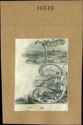 1830-50's. $5.00. 1) Large fancy five with canal scene on top and steamboat with ships in middle and bottom. 2) Compound proof of 3 vignettes on one printing plate. Includes separate vignettes, each with 1 allegorical woman with either "5" or "V" in oval, possibly a matching pair and a third small vignette of coat of arms on bottom with 2 deer, shield and eagle. Unique in archive. TCC.