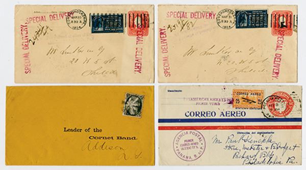 U.S. Postal History (4). Includes 2 U.S. Special Delivery covers with Conshohocken, PA, March 30 & 31, 1904 dated covers with 10cts adhesive Special Delivery stamp and 2cts postal stationary; 2 cents Blackjack on cover; and Republic 0f Panama, 1929 First flight cover for Pan-American airways addressed to Philadelphia, PA. Fine XF. (4)