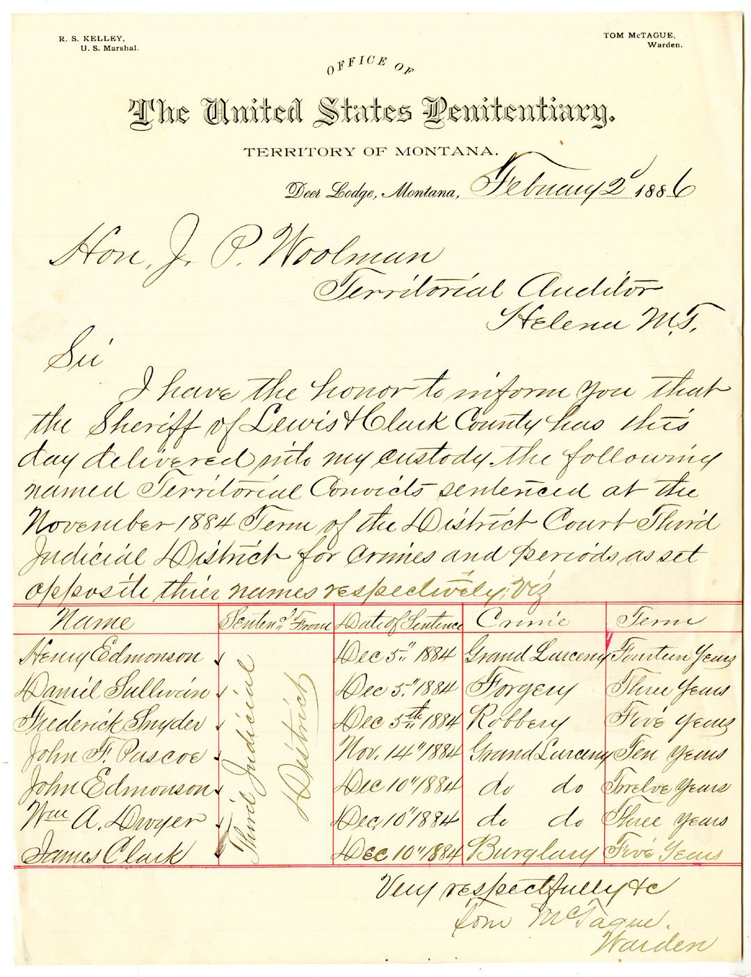 Montana Territory, 1886. Handwritten document from Tom McTague, Warden, to the Territorial Auditor, regarding prisoners which have been delivered into his custody from the Sheriff of Lewis & Clark County. The ledger below includes a full account of the prisoner's name, sentence location, date of sentence, crime, and term of sentence. VF condition. The Montana State Prison is a men's correctional facility of the Montana Department of Corrections in unincorporated Powell County, Montana, about 3.5 miles (5.6 km) west of Deer Lodge. The "Old Prison" served as the Montana Territorial Prison from its creation in 1871 until Montana achieved statehood in 1889, then continued as the primary penal institution for the State of Montana until 1979. Throughout the prison's history, the institution was plagued with constant overcrowding, insufficient funds, and antiquated facilities.