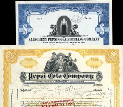 ca.1960's. 2 different specimen certificates used as models for updated certificates with archival production department notations listing changes on certificates. 1). Allegheny Pepsi-Cola Bottling Co. $-Odd. Specimen 1st Mortgage 6-3/4% Serial Bond. Blue border. Pepsi-Cola bottle vignette; 2). Pepsi-Cola Co. Transition Certificate to "PepsiCo, Inc.". <100 Shares. Yellow border. Allegorical figures flank old fashioned Pepsi bottle. Both with Red specimen overprints and POC's. VF condition. Rare Pepsi certificates. SBNC, SCBNC