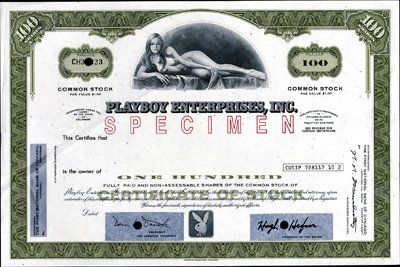 ca.1970-80's. 100 Shs. Specimen stock certificate. Famous reclining "Playboy" nude vignette. Olive green Border. Facsimile siignature of Hugh Hefner. "Specimen" overprint and POC's. XF condition. Scarce and popular stock certificate. ABNC.
