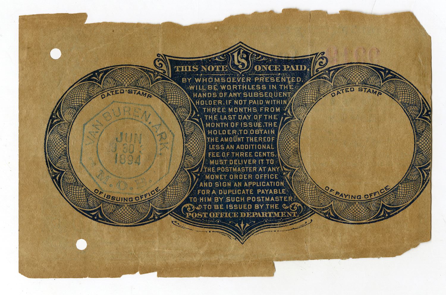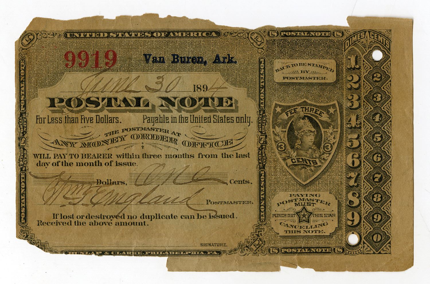 Van Buren, Arkansas. 1894, United States Postal Note. $0.01, Issued Postal Van Buren "Ark. M.O.B., Jun 30 2894" blue handstamp on back. Dated June 30th, 1894, Black text, "Fee Three Cents" shield at right, POCs over denomination at right, S/N 9919, VG condition with rough margins with pieces missing from the top and bottom margins and toning, still an extremely rare location for a postal note. Dunlap & Clarke. Rare Arkansas location Postal Note. Dunlap & Clark, Printer.