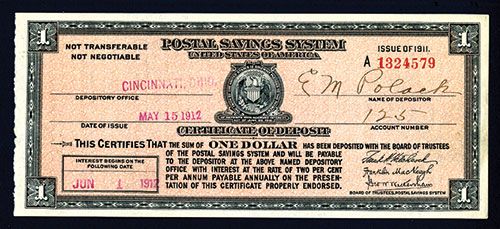 Cincinnati, Ohio. June 1, 1912. $1. Issued and uncancelled Postal Savings Certificate of Deposit, Federal Arms with eagle and shield in middle, black on light red underprint, back with Interest listings, AU condition. Scarce early issue date. Includes original envelope.