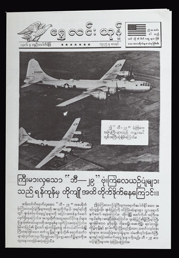 Burma. 4 page flier produced by the U.S. Office of War Information Psychological Warfare Team, APO 465, U.S. bombers on cover, images of Stalin, Churchill and Roosevelt in middle with photos of U.S. soldiers leaving ship; building bridges, and train, back with map and man holding explosive shell. VF.