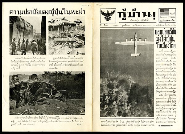 U.S. Produced Thai Propaganda Newspaper, ca. 1943-45. 4 page flier produced by the U.S. Office of War Information Psychological Warfare Team, APO 465, U.S. bomber on cover, images of soldiers with natives, military officers, German soldiers surrendering, back with U.S. tank, and men fighting. VF.