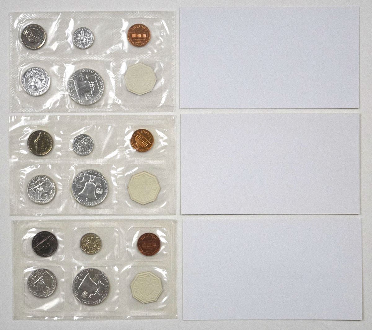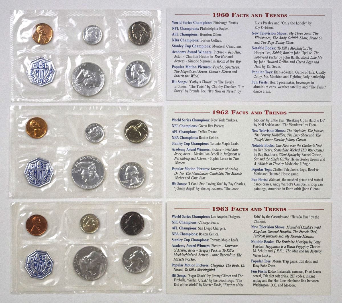 U.S., 1960-63. Lot of 3 U.S. Mint proof sets from 1960, 1962 and 1963, in original packaging containing 15 coins total, including silver Dimes, Quarters, and Half Dollars struck in .900 fine silver. Number of coins: 15; grams per coin: 2.50 g (dime), 6.25 g (quarter), 12.50 g (half dollar); silver fineness: .900; total grams (all coins): 71.25 grams; ASW weight (fineness × weight): 64.13 grams (2.062 troy oz). (15). Sold “AS IS” no returns accepted.
