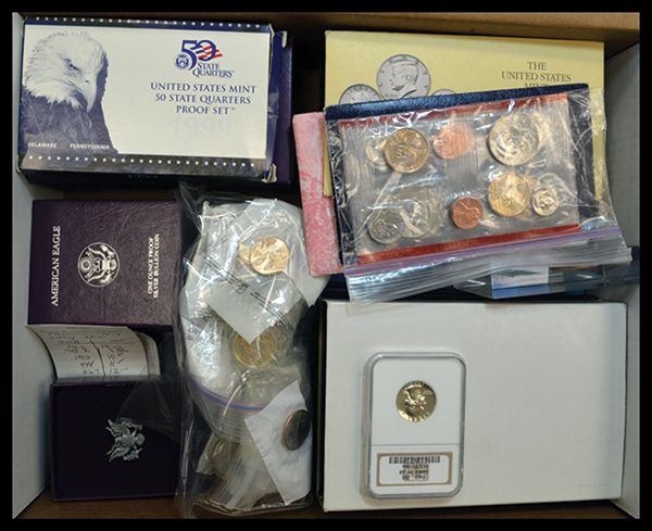 U.S. Proof and Mint Sets, Proof Silver Eagles and Other Numismatic Properties. U.S. Proof and Mint Sets, Proof Silver Eagles and Other Numismatic Properties. The following Proof Sets in original packaging are included: 1981(2 sets) 1982-1986, 1990, 1999 State Quarters, and 2007 Presidential Coins. 1986, 1987 and 1990 Proof Silver Eagles. Also included are an 1897 Barber Dime AU, a Patriotic Token AU, a 1963 Washington Quarter NGC Cameo Proof 68, a Lindbergh medal, a few modern mint sets, some coin-related first day covers, some State Quarters, and more. Should be seen. Sold as is.