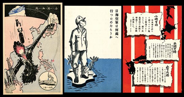 Japan, ca. 1943-45. Lot of 3 different propaganda leaflets or fliers from the U.S. Office of War Information Psychological Warfare Team, APO 465. It includes 3 original fliers or propaganda leaflets that are written in Japanese for Japanese soldiers. Included are leaflets with hand drawn illustrations of Japanese soldier standing on small island; red, white and black leaflet with Japanese and also a map and a leaflet showing a U.S. Bomber bombing a Japanese pipeline, all 3 with Japanese text on the back. All are in XF condition almost as printed. Rare and historic U.S. World War II Psychological warfare items.