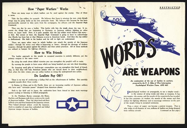 Burma, Thailand, Japan, ca. 1943-45. Historic folder from the U.S. Office of War Information Psychological Warfare Team, APO 465. This was a Restricted document that was used for internal purposes as well as for high level politicians. It includes 7 original fliers or propaganda leaflets stapled on the top left corner to the interior of the 4 page leaflet. It describes each flier by a number printed on each one. They are written in Burmese, Thai and the surrender leaflet in Japanese for the Japanese soldiers. Included are leaflets with hand drawn illustrations of U.S. bombers; Roosevelt; Downed American and allied fliers; American flag and portrait of Truman. All are in XF condition almost as printed. Rare and historic U.S. World War II Psychological warfare items.