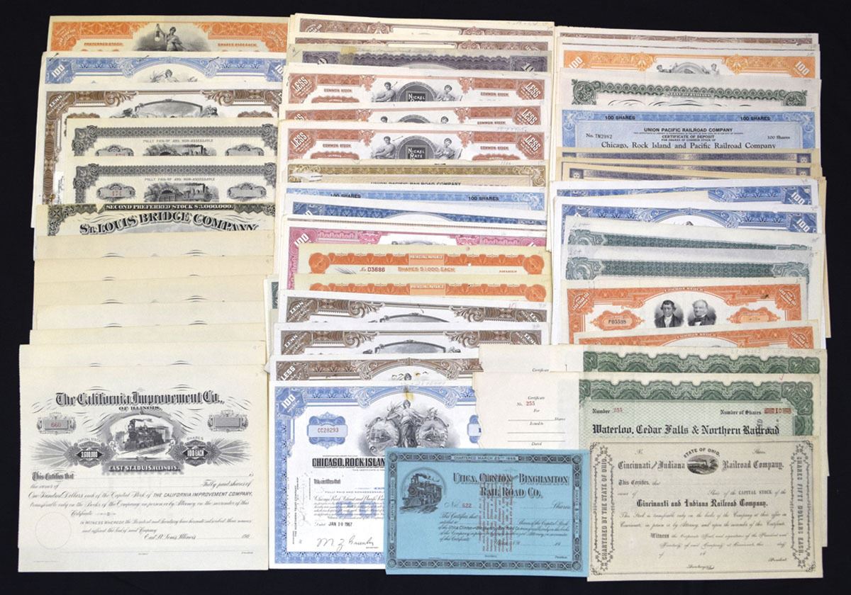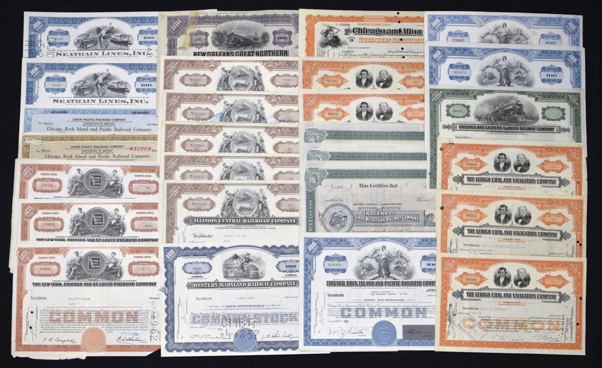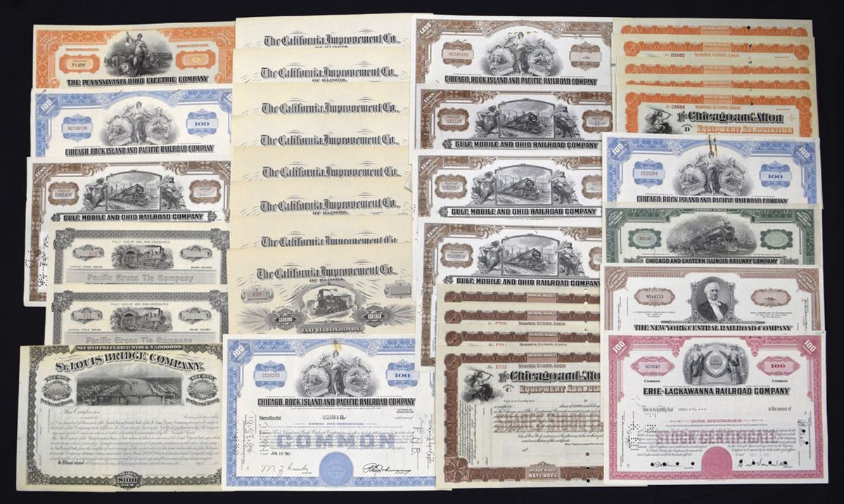 Various States, ca. 1870s-1960s. Lot of 75+ Issued, Unissued, Cancelled, and Remainder Stocks and Bonds from major and regional American railroads, Includes: Chicago, Rock Island & Pacific Railroad Co., Illinois Central Railroad Co., Erie Lackawanna Railroad Co., Gulf, Mobile & Ohio Railroad Co., New York Central Railroad Co., Seatrain Lines Inc., New Orleans Great Northern Railroad Co., Western Maryland Railway Co., Indiana & Lake Michigan Railway Co., Waterloo Cedar Falls & Northern Railroad Co., Utica Clinton & Binghamton Railroad Co., Cincinnati & Indiana Railroad Co., Lehigh Coal & Navigation Co., St. Louis Bridge Co.; California Improvement Co., and more. Certificates display classic engraved vignettes of locomotives, allegorical figures, bridges, and portraits, with border colors in brown, blue, green, orange, and pink. Condition varies from Fine to Extremely Fine overall. A diverse and attractive collection that combines both railroad stock and bond issues, offering broad appeal to collectors of American rail history. (75+). Sold "AS IS" no returns accepted.