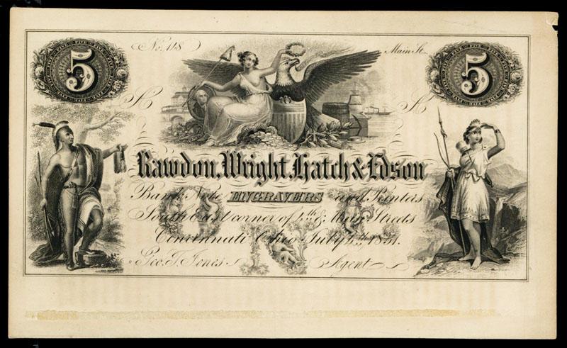 U.S. Rawdon, Wright, Hatch & Edson - Engravers Advertising Banknote.Cincinnati, Ohio, 1851. P-Unlisted. 5 Denomination. Banknote engraver ad note from famous company. Native American man and woman on left and right, patriotic eagle and shield on middle with allegorical woman, back blank.