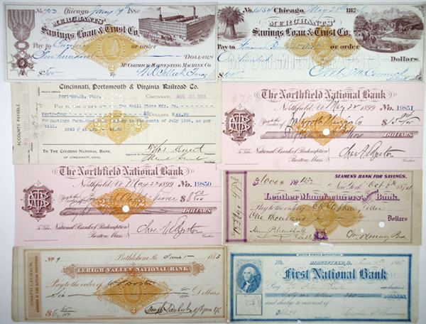 Lot of 16 revenue imprinted checks. Includes a wide variety of types and colors. Includes railroad, banking and related topics. VG to XF condition. Attractive assortment. (16)