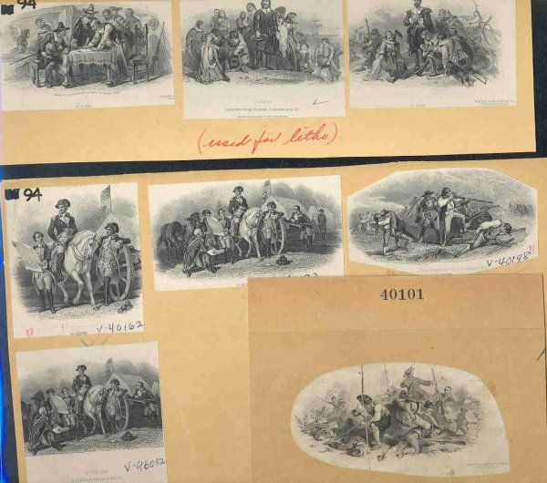 ca.1840's-80's. 18 different Revolutionary War (11); Civil War (2) and Colonial (5) related vignettes. Most were used on obsolete banknotes, stocks, bonds and drafts. All are printed on india paper and mounted on manila cards. Printers include ABNC; BCC; TCC; RWHE; Homer Lee BNC and un-attributed. Titles include "Signing the First Constitution on Board the Mayflower, 1620"; "Return of the Foragers"; "Paul Jones"; "Landing of the Pilgrims, A.D.1620"; "Lincoln's Birth Place"; "Landing of Pilgrims"; ""Ram Cartridge" with the balance untitled. All of the vignettes range from 1 to 3 inches in size. Mostly choice condition. Please inspect. Rare group of early War related vignettes, with most well known.