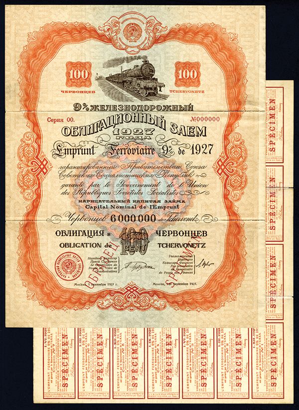 U.S.S.R. 9% Railway Loan (Moscow)of 1927. Specimen Bond. Moscow. September 1, 1927. 100 Tchervonetz. Fine condition with separations archivally reinforced, Dark brown on orange and m/c, Obrasetz overprints, "000000" serial numbers, coupons attached. Rare as specimen.