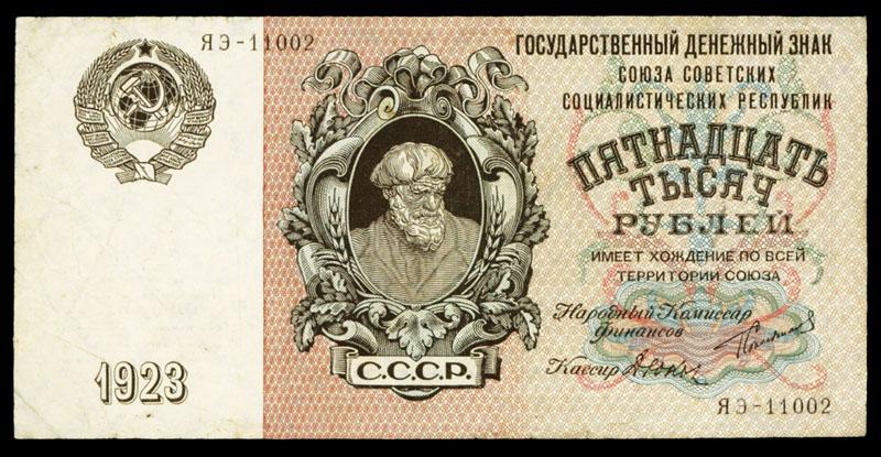U.S.S.R. State Currency Note, 1923 (1924) Issue. Russia, 1923 (1924). 15,000 Rubles, P-182. Issued banknote. Brown on m/c underprint, man at center, arms on left. Dyukov signature. S/N YAE 11002, PMG graded Very Fine 25 with notation of paper pull which I cannot find, Very attractive example with great colors and almost no detracting issues for the grade.