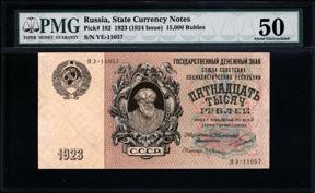 1923 (1924) Issue. 15,000 Rubles, P-182, Brown on m/c with portrait of man in middle, The fourth of 6 different signature varieties being offered in this auction of the 10 that are known. PMG graded "50 About Uncirculated". There is a small area on the back upper right that shows evidence of previous mounting. Another scarce signature variety in high condition.