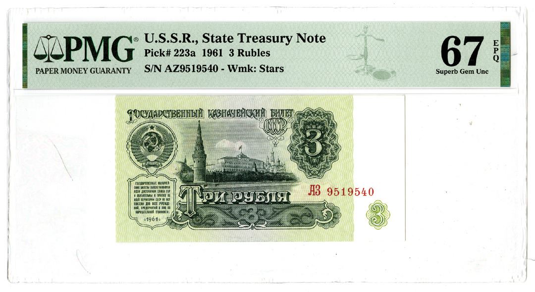Russia, 1961, 3 Rubles, P-223a, Issued banknote, S/N AZ9519540, PMG graded Superb Gem Uncirculated 67 EPQ. Attractive note.