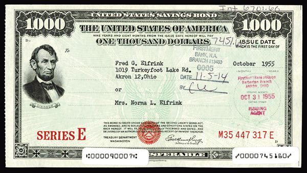 Issued in Akron, Ohio. $1000, Issued and cancelled bond, Black on light green underprint, Abraham Lincoln on left, eagle in undertint, back with small green text, Secretary of Treasury George Humphrey signature, The bond has red serial numbers and then additional serial numbers on white tabs on the bottom margin, Choice AU to Uncirculated. Rarely seen high denomination. BEP.