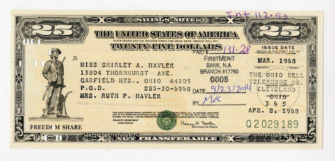 Washington, D.C. (Issued in Cleveland, OH). March 1968, $25, I/C, Minute Man on left, Printed in black on light yellow underprint on IBM punch card, back has blue printing with redemption information and room for endorsements, Facsimile signature of the Secretary of the Treasury, Henry H. Fowler. Rare.