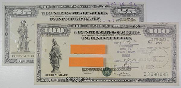 Includes two notes. Both signed by the Secretary of the Treasury, Henry H. Fowler. First is $25, Minute Man on left and second is $100, Standing Liberty on left. Both on IBM punch card. Issued in Ohio. About Uncirculated condition. Rare.