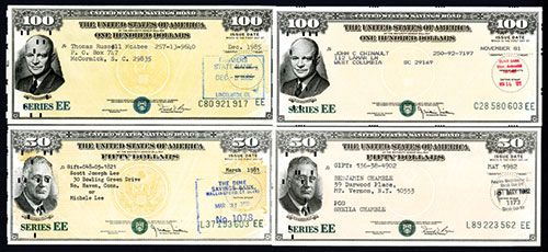 Lot of 4 different signature variety Series EE, $50 (2) and $100 (2) Savings Bonds, dated between 1981 and 1985, All similar design and color except they have different signature varieties and different portraits. Uncirculated condition. Scarce signature variety group. Face value $300. Printed on IBM punch cards.