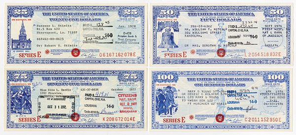 Washington, D.C. (Issued in Shreveport, LA). 1976 to 1978. Lot of 4 different bonds, all Series E with different denominations and signed by the Secretary of the Treasury, William E. Simon, Includes $25; $50; $75 and $100, all are on IBM punch cards. All were issued in various states and cancelled in Louisiana. All are in AU to Uncirculated condition. From a new find of U.S. modern savings bonds.