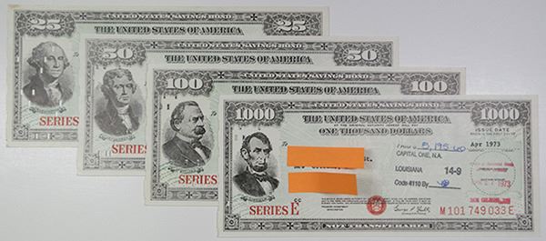 Washington, D.C., Lot of 4 different bonds, all Series E with different denominations and signed by the Secretary of the Treasury, George P. Shultz. Includes $25; $50; $100; and $1000, printed on IBM punch card size paper. All are cancelled in Louisiana and were issued in various states (Wisconsin, Louisiana). All are in AU to Choice Uncirculated condition. (4)