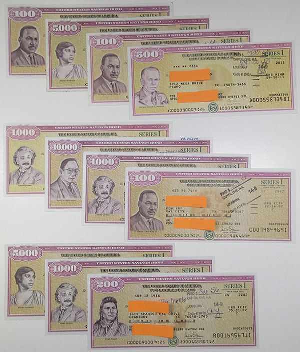 Washington, D.C., Lot of 11 different bonds, all are Series I bonds with portraits of Martin Luther King; Marian Andreson; Albert Einstein, Chief Joseph and General George C. Marshall. The different denominations and signed by various different Secretaries of the Treasury. Includes Timothy F. Geithner signed $100 with Martin Luther King; and $500 with General George C. Marshall; John W. Snow signed $1000 with Albert Einstein; and $10000 with Spark Matsunaga; Robert E. Rubin signed $100 with Martin Luther King; and $5000 with Marian Anderson; and Laurence H. Summers signed $1000 with Albert Einstein; and Paul H. O'Neill signed $100 with Martin Luther King; $200 with Chief Joseph; $1000 with Albert Einstein; and $5000 with Marian Anderson. All are on IBM punch card size paper. All were issued in various states and cancelled in Louisiana. All are in AU to Choice Uncirculated condition. From a new find of U.S. modern savings bonds. (11)