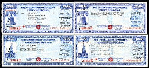 Lot of 4 different signature variety Series E, $25 (2) and $50 (2) Savings Bonds, dated between 1976 and 1979, the $25 bonds have Independence Hall on left and the $50 has the Liberty Bell on the left. Blumenthal and Simon Facsimile signature on each pair of bonds. AU to Uncirculated. Face value $150.