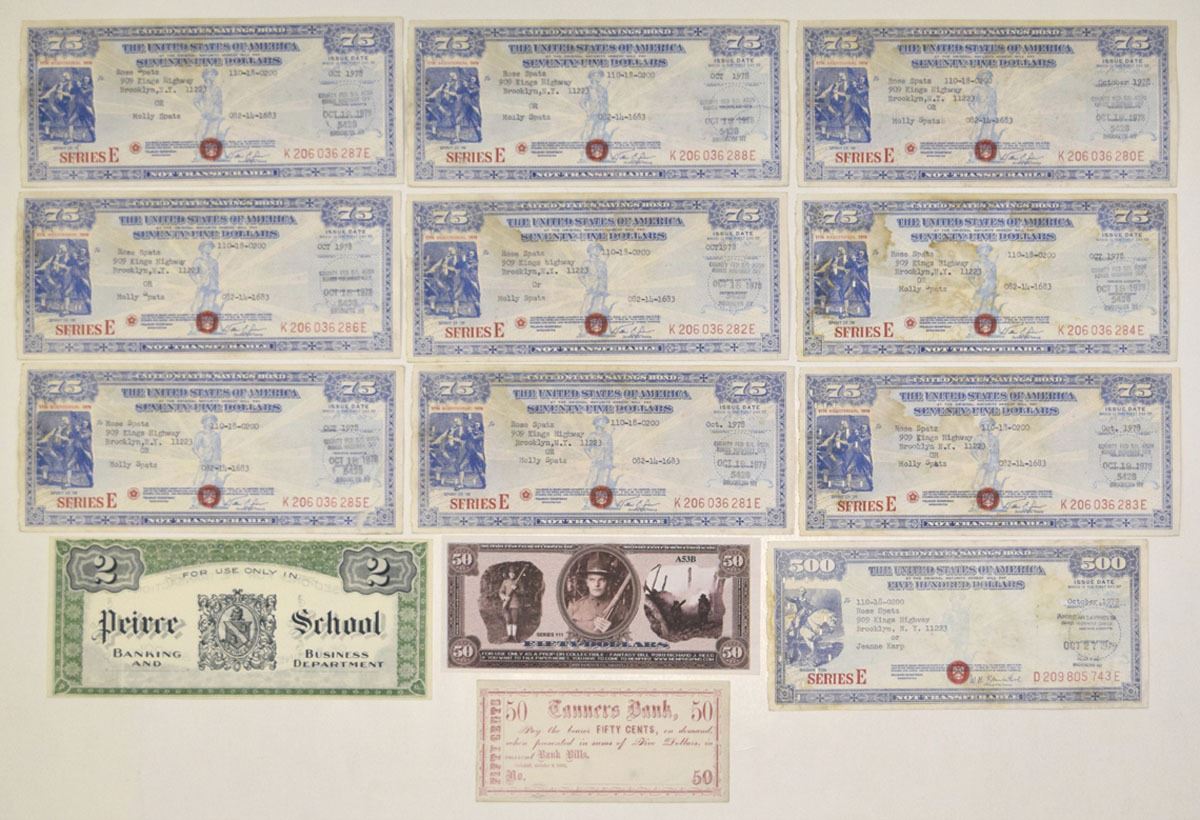 Various States...., ca. 1940-70s. Lot of 13 Savings Bonds and Training Notes, Includes: U.S. Series E, $75, War Savings Bonds (9), ca. 1970s; Series E $500 Bond; 1890-1900s, Peirce School of Business Department $2 Training Note; 1862, Catskill, NY, 50 Cents Tanners Bank Remainder Obsolete Note; and a WWI-era War Loan Bond Replica. Printed by the U.S. Bureau of Engraving & Printing and private firms. Conditions range from VG to AU overall with folds, stains, and light handling. (13). Sold ‘AS IS’ no returns accepted.