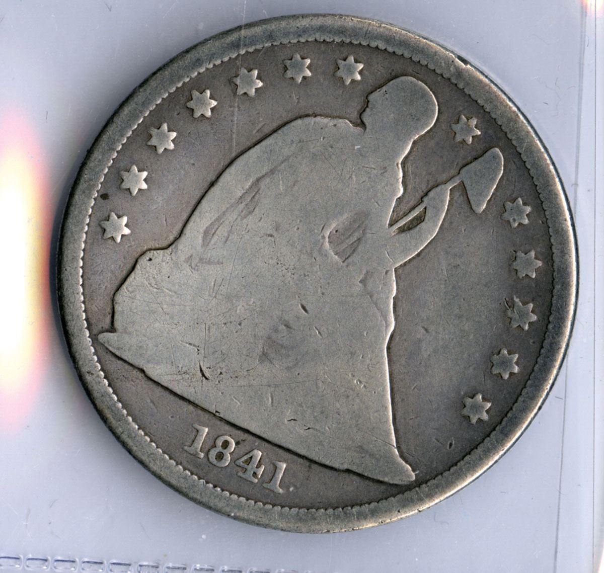 U.S.A., 1841. Seated Liberty $1 Silver Dollar featuring Liberty seated with shield and staff on the obverse and a heraldic eagle reverse. The shield looks like it may have been tooled, Struck in .900 fine silver, weighing 26.73 grams with an approximate 38 mm diameter and an actual silver weight (ASW) of 24.06 grams (0.7734 troy oz). Seated Liberty Dollars were produced from 1840 to 1873 and represent the early U.S. silver dollar series following the Gobrecht design.