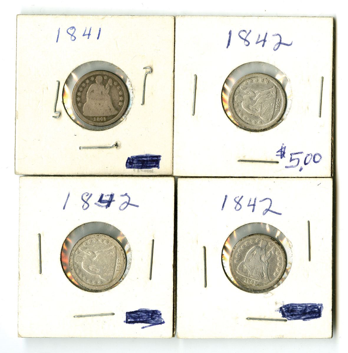 Philadelphia, Pennsylvania, 1841-42. Lot of 4 Seated Liberty Dimes, 1841-P and 1842-P (3). Coins range from Good to VG with one of the 1842 coins having small scratches. (4 Coins).