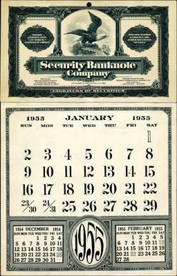 1955. Complete advertising calendar for SBNC with eagle on top and all 12 monthly pages intact except for the last page which is missing the bottom 1/4 of the page with the large "1955" and the previous and next month in small lettering. Printed in green. The top part of the calendar is like a large advertising note with list of items printed and addresses of locations throughout the country. Rare advertising calendar and the only intact issued one found in archive. SBNC